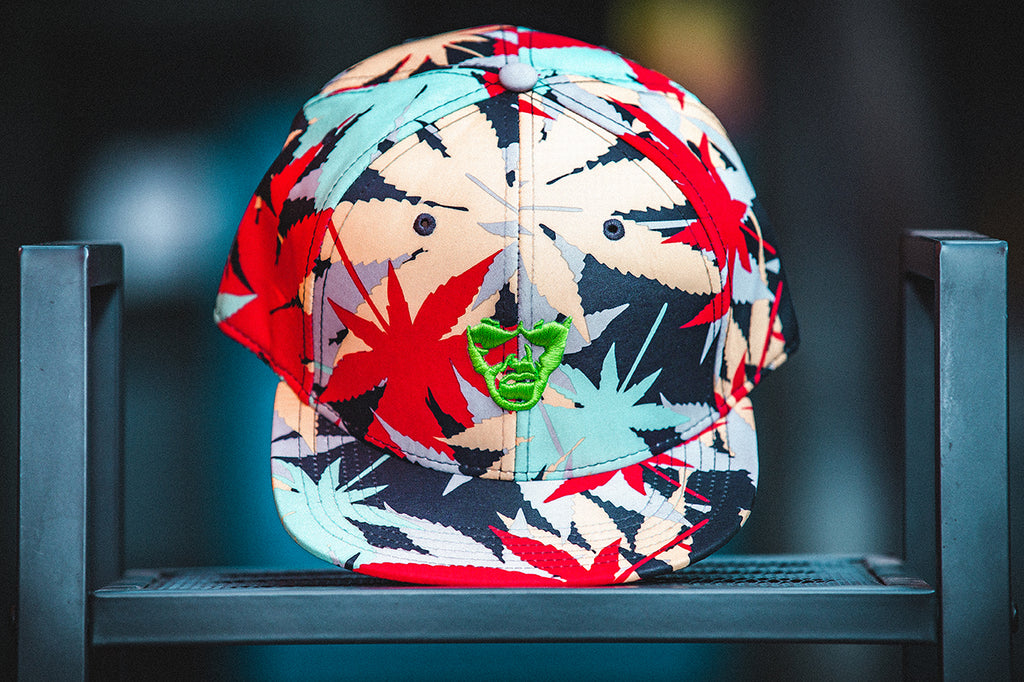 100% cotton snapback cap with Bright Cannabis leaf patterns and puff embroidery