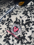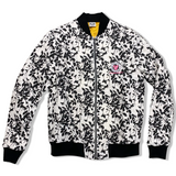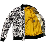 "Luxe-Leafy Black & White Bomber" is a varsity cut jacket that is made of a vine and leaf printed and textured cotton Carolina Herrera fabric. The shiny gold satin lining with the inner pocket makes it even classier when it's taken off. This is the only one of its kind.