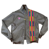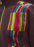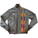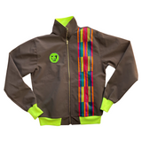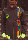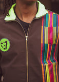 The AFRICOAT has a colorful waxed cotton strip of fabric from Africa that highlights this chocolate brown water-resistant poly-cotton mid-weight jacket. The neon green ribbing trim on the wrist, waist, and collar make this a statement piece. Topped of with a circular chenile logo on the right chest, this is a limited exclusive piece for all fly occasions.