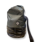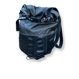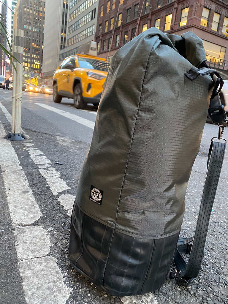The recycled rubber bottom and rip-stop nylon upper portion allows the bag to be rolled down into a compact carry or expanded to carry several pounds of bulky belongings. There is a detachable rubber shoulder strap that allows this bag to be used over the shoulder or as a cross-body carry. The natural elasticity of the rubber works wonders in relieving stress points in the carrier’s back, arm, or shoulder as the slight bounce absorbs much of the natural weight of the bag’s contents.