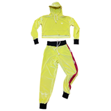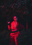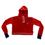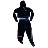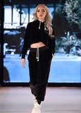 These Stretch velvet hooded crop-top sets are luxuriously soft. The fabric melts onto your skin and fits to make every wear feel like a vacation within. The wide body and cuffed sleeves give room for the arms and legs to breathe easily. Accented with embroidery and trim along the side of the leg, these sets are epitome of athleisure.