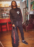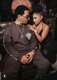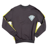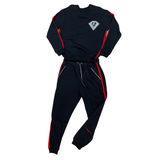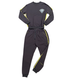 The Stripe Crewneck sweatsuit is a sporty mid-weight fleece 360gsm 100% cotton fashion-forward matching outfit that is comfortable for most occasions in transitional spring weather. The left-chest has a stitched on reflective PVC/reflective patch. A contrast-color stripe travels down the arm and the side of the top.