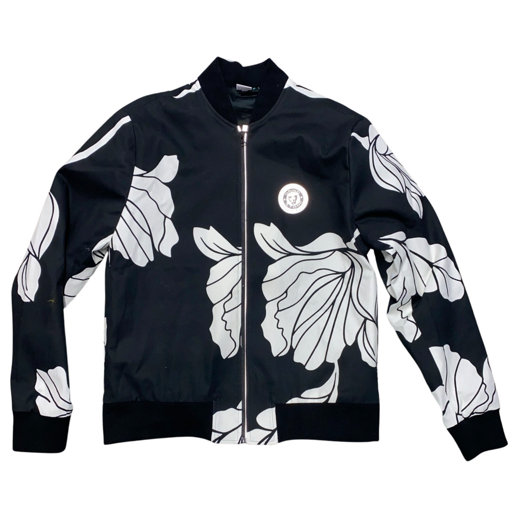This sleek bomber style jacket is a light Italian denim with sweeping floral patterns. The contrast between Black & White creates an illusion of a work of art being worn. The circle reflective silver Grindstone logo patch on the left chest is the perfect subtlety statement of the brand.